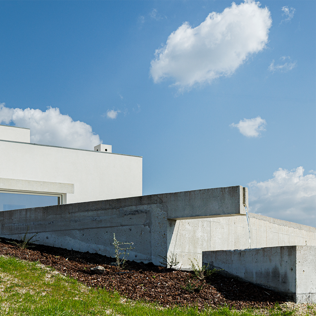 A estrutura é resolvida através de um sistema porticado em betão armado, composto por pilares, vigas e lajes aligeiradas de vigotas pré-esforçadas, organizados segundo uma malha regular e coerente com a arquitetura. Esta solução garante transmissão eficiente de cargas, controlo de deformações e execução racional. O betão aparente nas padieiras exteriores e no embasamento reforça a expressão da lógica estrutural e a integração do edifício na topografia natural.
